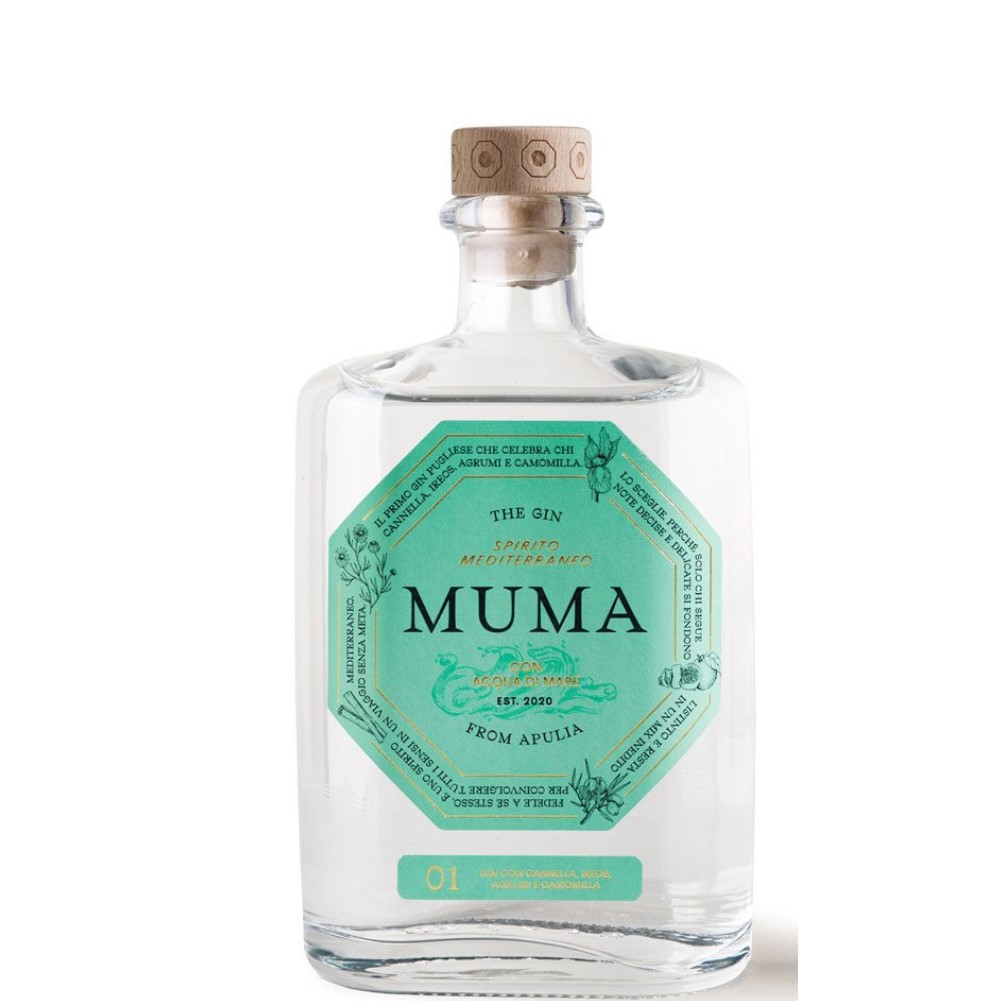 MuMa è un progetto in continuo divenire, un viaggio nel gusto, nel mare e nella terra di Puglia. Dedicato ai più raffinati amanti del bere miscelato, si sviluppa attraverso la ricerca, la selezione e l’utilizzo in purezza di 6 botaniche – prodotte da culture sostenibili – che rappresentano al meglio un percorso di estrazione ed esaltazione di sapori e aromi unici, che insieme completano alla perfezione le caratteristiche dei singoli ingredienti. La Camomilla, dolce e intensa, per arricchire la nota floreale dell’Ireos che infonde morbidezza e texture. La Cannella,con i suoi sentori orientali, speziati e ricchi di fascino. Limone e Arancia, gli ambasciatori del Mediterraneo e della Puglia. Il Gineprosimbolo del Gin e della sua storia. E’ l’acqua purificata del Mar Mediterraneoa completare la preparazione insieme all’ottavo ingrediente, segreto e gelosamente custodito nella ricetta nota solo ai 4 soci, che ammanta di ulteriore mistero e fascino MuMa Gin. Stupendamente limpido alla vista, Muma ha profumi agrumati e balsamici. In bocca l’esperienza parte dolce e delicata per poi sprigionare le punte delle spezie e le note classiche del ginepro. E il finale intenso si conclude con una delicata sapidità.